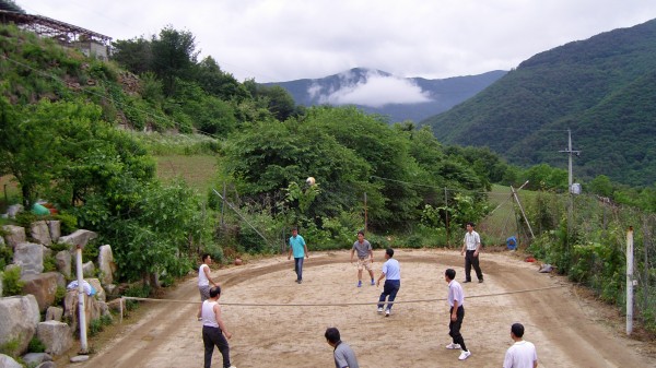 가족이나 단체가 함께 즐길 수 있는 넓은 족구장이 있습니다.